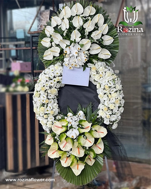 تاج گل ترحیم شیک مسجدی با طراحی ایستاده و متناسب با فضای رسمی مساجد، یکی از بهترین انتخابها برای عرض تسلیت به خانوادههای داغدار است. این تاج گل از گلهای مقاوم و نمادین شامل لیسین، آنتریوم و ارکیده ساخته شده است که هرکدام پیام خاصی در خود دارند: