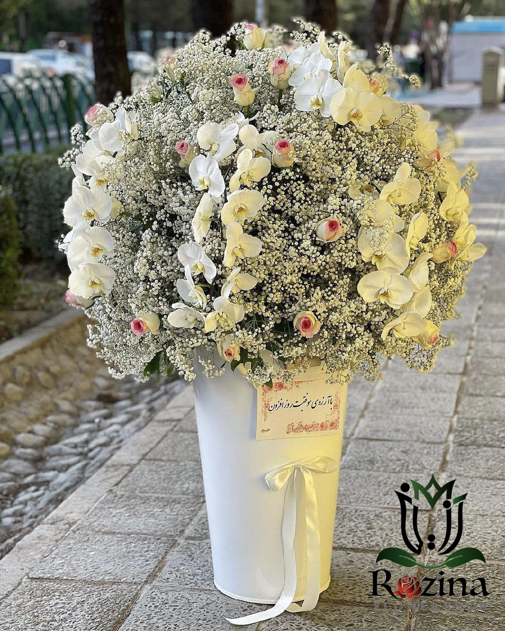 وقارِ سپید با لبخندِ گُلبهی ارکیدههای سفید با فرم مجسمهوارشان امضای لوکس و مینیمال کار هستند؛ رزهای هلندی گُلبهی گرمای شاعرانه و رمانتیسمی کرِمی میآورند. رزهای مینیاتوری گُلبهی، حس “بارانِ شکوفهها” را میسازند و میخکها با بافت چیندارشان، عمق و لطافت کلاسیک اضافه میکنند. ژیپسوفیلا مثل مهی روشن، همهچیز را یکدست میکند و گلِ پنبه با پفِ سفیدش، امضای تکسچرِ زمستانی-لوکس میگذارد؛ اکالیپتوس سبزِ سدویی هم رایحه و توازن طبیعی میدهد.
